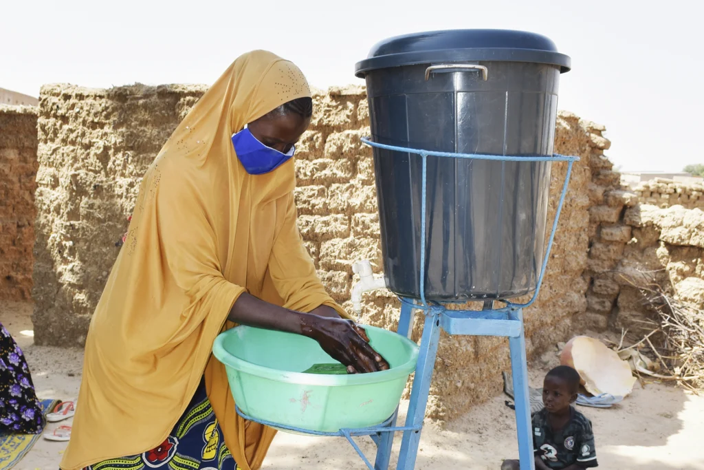 Eine Handwaschvorrichtung ermöglicht das regelmäßige Händewaschen mit Wasser und Seife auch dort, wo kein fließendes Wasser vorhanden ist, und wird gezielt in Gemeinden, bei Frauengruppen (GASPA), Schulen und im Rahmen von Sensibilisierungssitzungen eingesetzt.